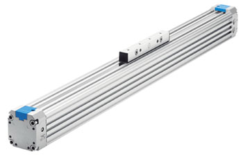 Der kolbenstangenlose Linearantrieb mit beidseitig einstellbaren Endlagendämpfungen überträgt seine Kraft über eine formschlüssige Kolben-Mitnehmerkonstruktion und ist durch ein geschlitztes Profilrohr verdrehgesichert.