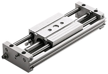 Der Schlitten des kolbenstangenlosen doppeltwirkenden Zylinders wird durch wechselseitiges Zuschalten der Druckluft umgesteuert.