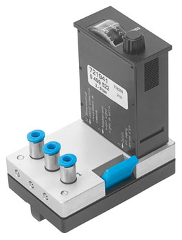 The time delay valve is made up of a pneumatically operated 3/2-way valve, a one-way flow control valve, and small air accumulator. When the necessary pressure is reached at the control connection 10 of the unit, the 3/2-way valve switches and stops the flow from passing between 1 and 2.